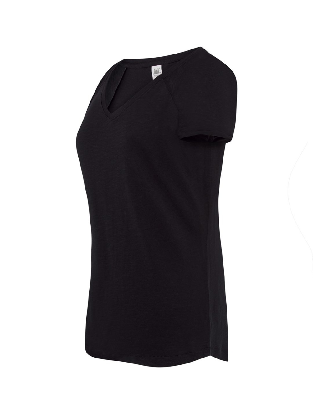 Damen-T-Shirt mit Raglanärmeln. Single-Jersey, hochgekrempelte Ärmel. Modisches Bündchen mit tiefem V-Ausschnitt. 100% Baumwolle.
