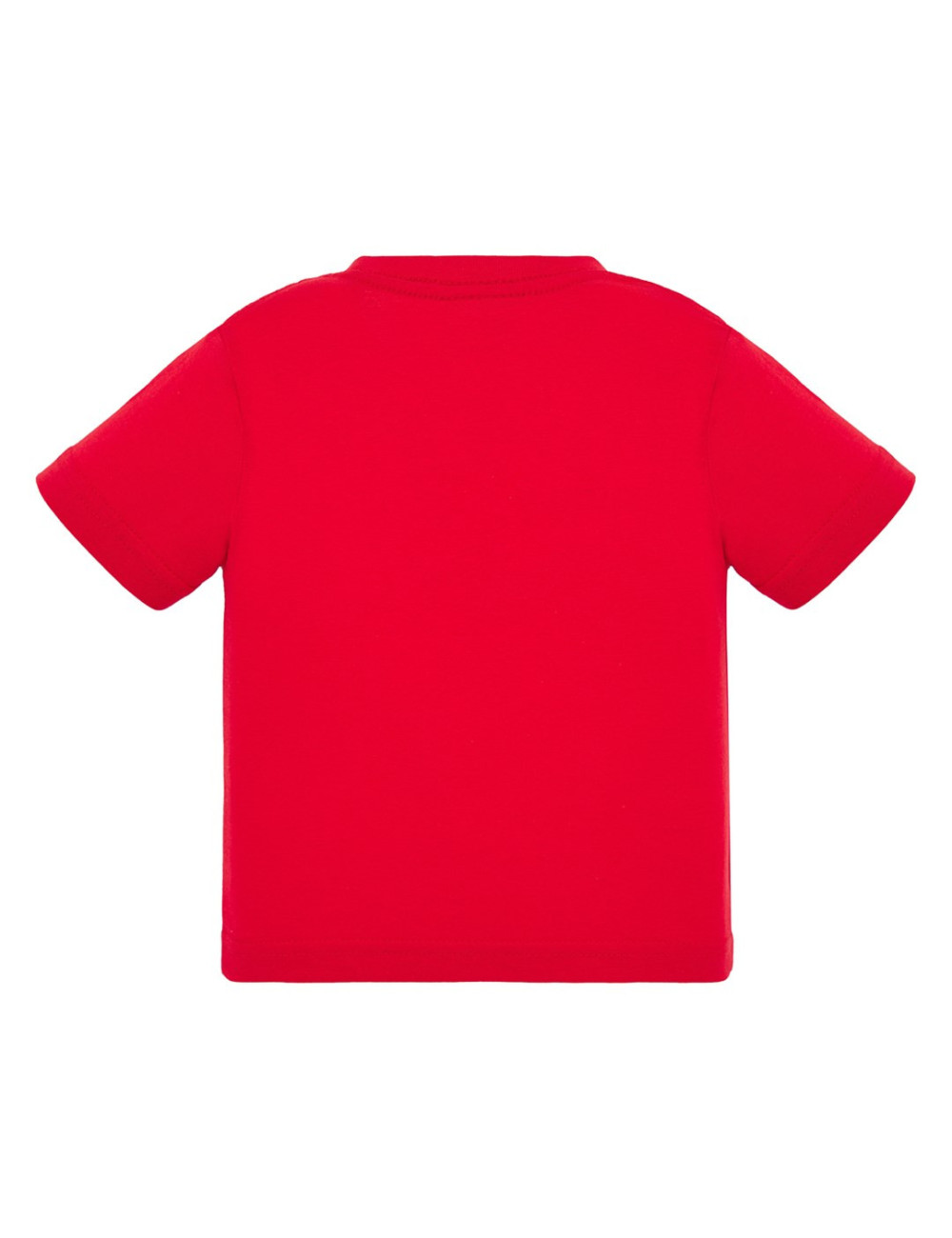 Baby-T-Shirt mit kurzen Ärmeln. Größe 0, mit Knöpfen an der linken Schulter befestigt. Lycra-verstärkte Manschette. Keine Seitennähte. Doppelte Nähte an den Schultern. Verstärkungsband. 100 % stabilisierte Baumwolle