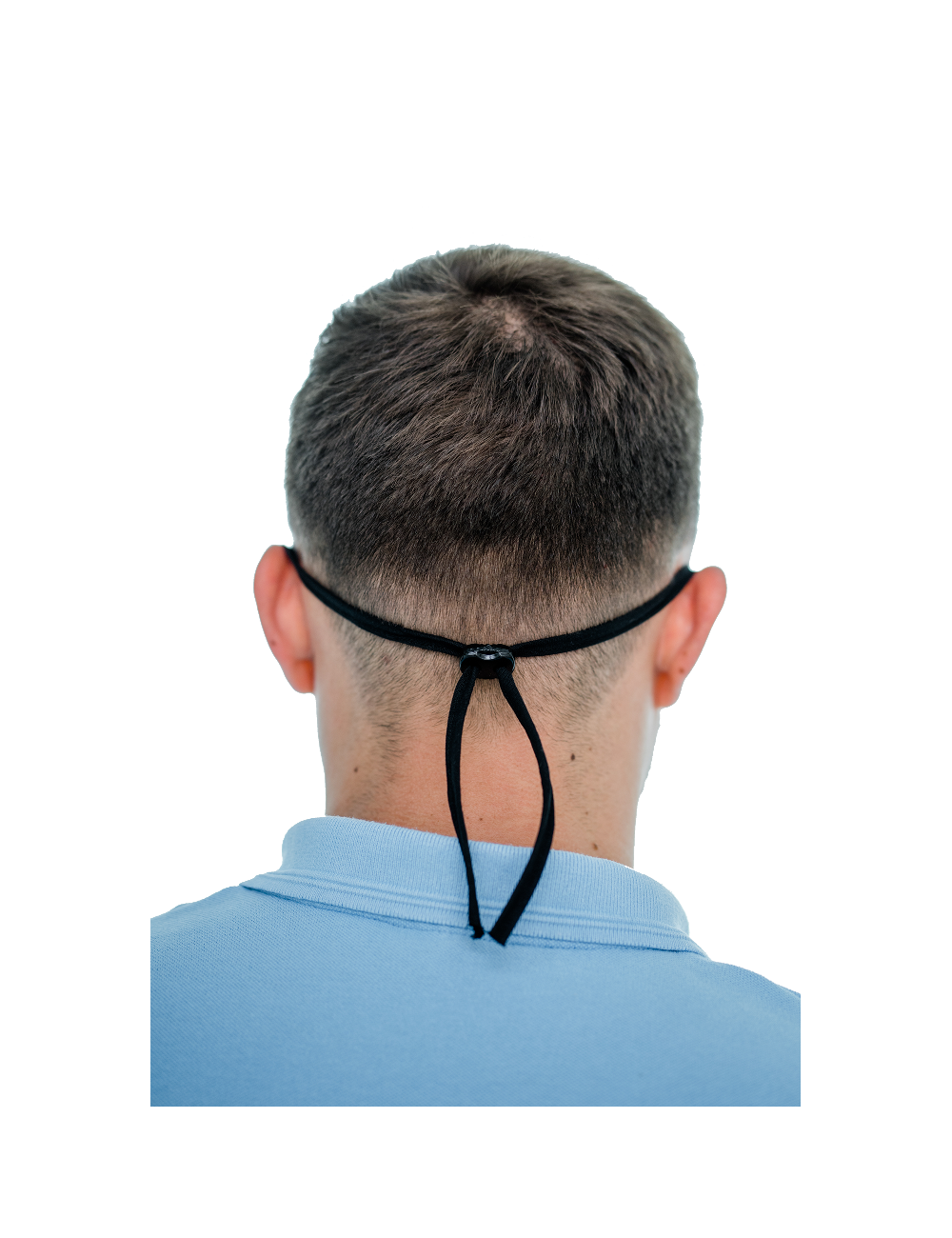 Führen Sie die Schnur durch die Löcher im oberen Teil des Mini-Visiers und passen Sie die Größe des Riemens mithilfe des Einstellgriffs (Stopper) am Riemen an die Breite Ihres Gesichts an. Der Riemen sollte so angebracht werden, dass sich der mittlere Teil des Riemens auf der Innenseite der Maske befindet und Nase und Gesicht direkt berührt. Eine solche Montage ermöglicht eine präzise Anpassung des Gesichtsschutzes an die Gesichtsform.