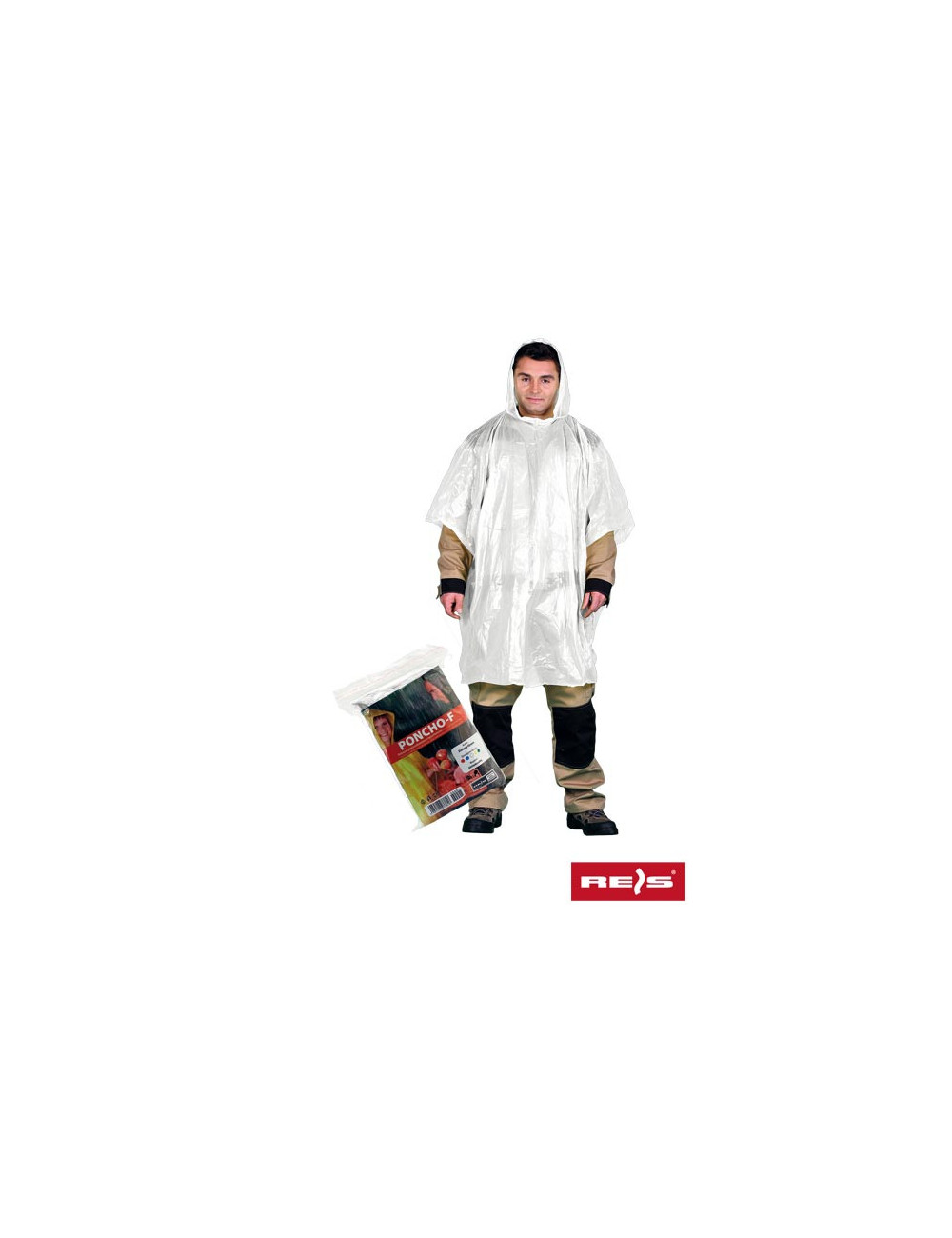 Regenmantel im Poncho-Stil. - 100 % Polyethylen – Kanten ersetzen die Ärmel und reichen bis zum Ellbogen – Kapuze mit dem Umhang verbunden – perfekt für Regenwetter, wenn Bewegungsfreiheit erforderlich ist – jedes Teil in einer separaten Tasche verpackt