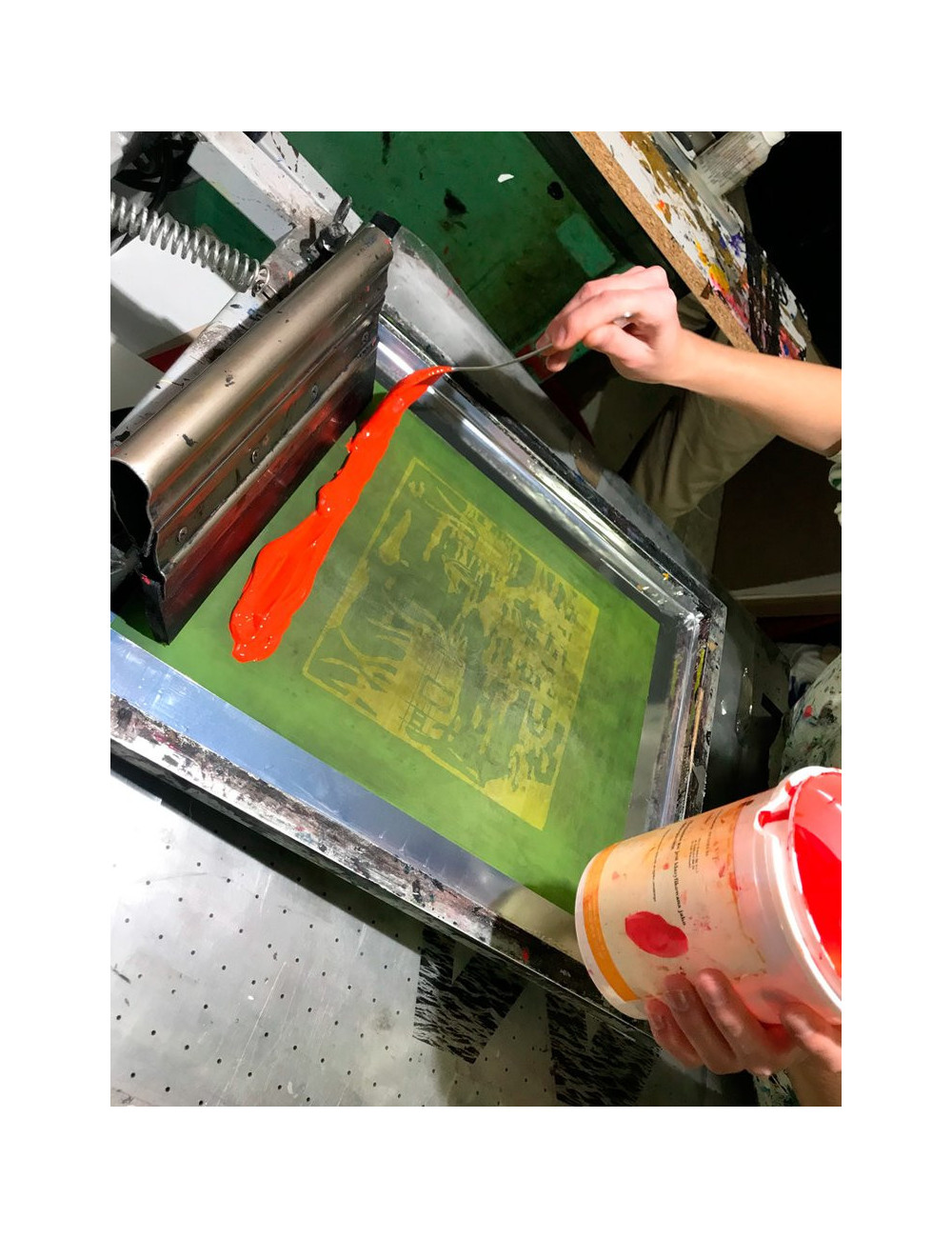 Drucken: Fertige Matrizen werden in eine Siebdruckmaschine eingelegt. Die Farbe wird auf die Matrize aufgetragen und dann durch das Netz auf die Oberfläche des bedruckten Materials gedrückt.