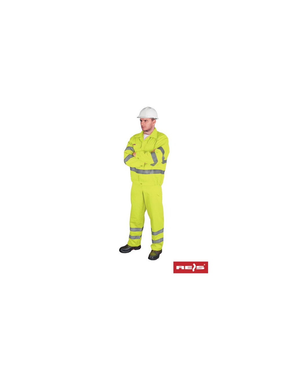 Hi-Vis clothing consisting of a jacket and bib pants. - fluorescent fabric: 86% polyester, 14% cotton - weight 300 g/m2 - in the lower parts of the jacket, sleeves and trousers there are reflective stripes that ensure good visibility of the user - sweatshirt: fastened with buttons, two pockets fastened with buttons on the front side turnip. - elastic band at the bottom of the sweatshirt, protecting against wind - pants: adjustable length with braces, additional buttons at the waist. - two side pockets, one on the leg, additionally three pockets on the upper part of the trousers and a key clip - ideal for road workers and law enforcement - certified by the German TUV institute - meets the requirements of the EN471 standard (clothing class - 2, reflective material class - 2)