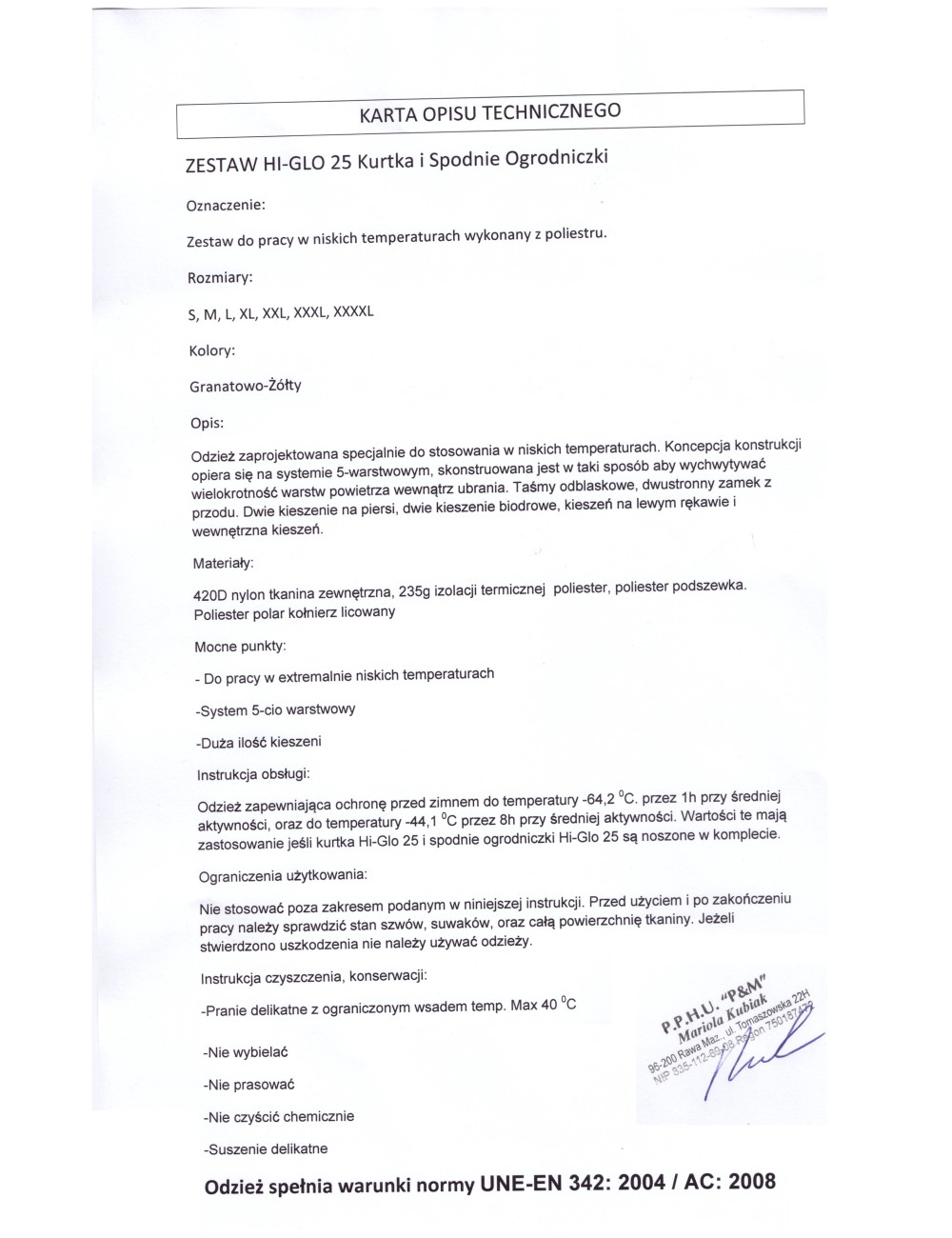 Odzież zgodna z normą EN 342 doskonale chroni przed zimnem. Praca w niskiej temperaturze, wymaga specjalistycznej odzieży, zapewniającej pracownikowi skuteczną ochronę i utrzymującą ciepłotę ciała. Praca w środowisku zimnym, charakteryzuje się temperaturą równą lub niższą -5℃. Pod uwagę bierze się również wartość odczuwalną, która oprócz temperatury powietrza, uwzględnia jego wilgotność oraz wiatr. Należy pamiętać, aby odzież była sucha- jej zmoczenie, może mieć bardzo negatywny wpływ na poziom ochrony przed zimnem. Jeżeli chcemy jak najlepiej zabezpieczyć się przed szkodliwym działaniem niskich temperatur, dodatkowo polecamy stosowanie specjalistycznych spodni, rękawic, ciepłego obuwia oraz nakrycia głowy. Ubiór powinien być dopasowany i porządnie zapięty.