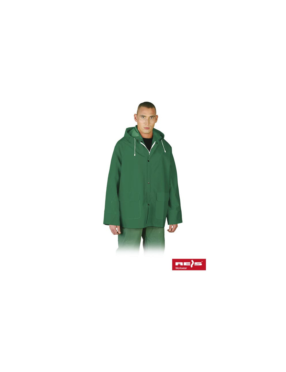Kurtka przeciwdeszczowa z kapturem. - 70% PCV, 30% poliester - zapinana na suwak z dodatkowymi zapięciami na napy - kaptur ściągany na troczki - dwie kieszenie zewnętrzne - ściągacz w rękawach zabezpieczający przed wiatrem - system wentylacji na plecach