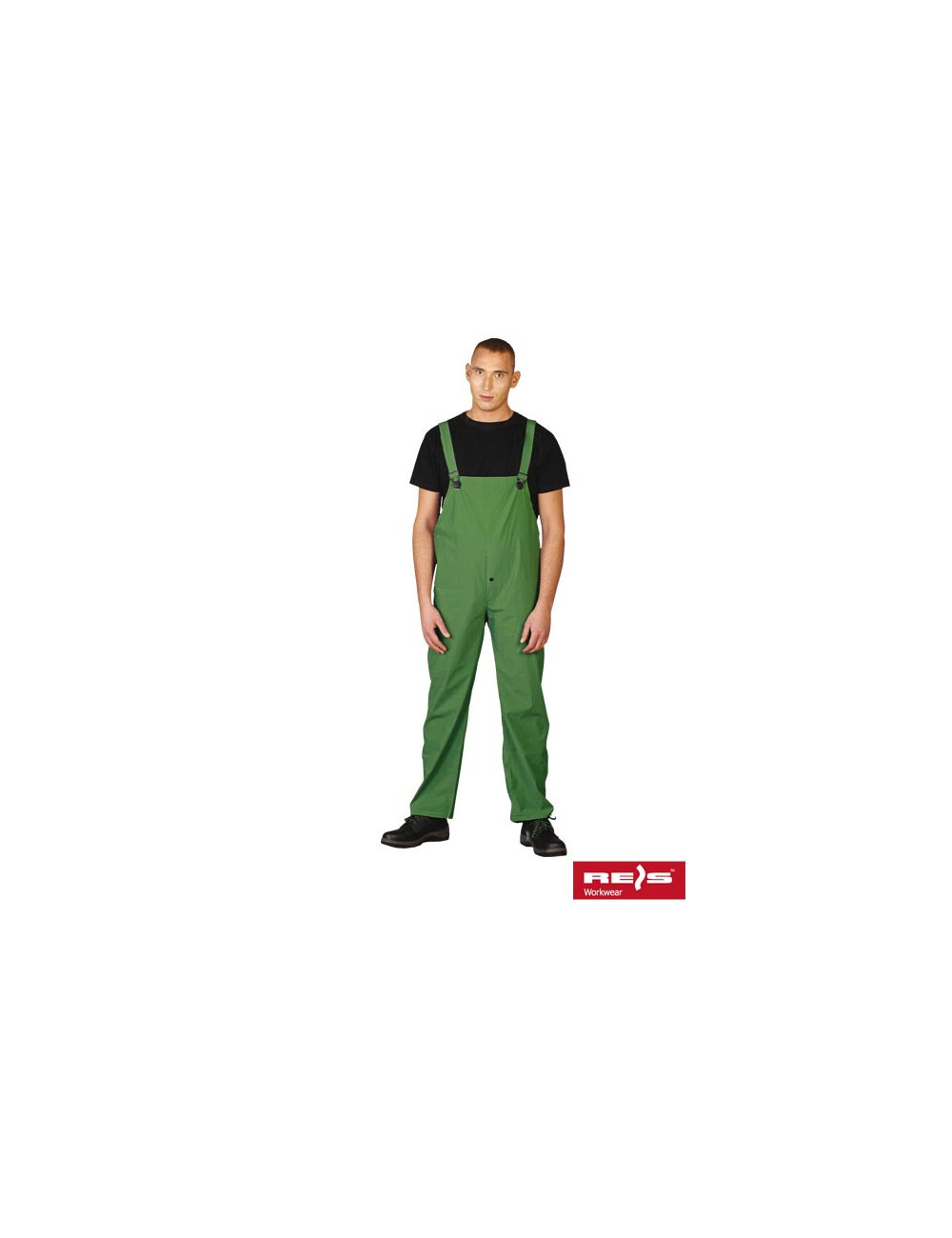 Spodnie ogrodniczki przeciwdeszczowe. - 70% PCV, 30% poliester - możliwość regulacji w długości szelkami, które w tylnej partii mają gumkę - możliwość regulacji w szerokości, dzięki napom znajdującym się w pasie z tyłu spodni - dodatkowe zapięcie u dołu spodni, dzięki czemu można zwęzić dół nogawek, by ograniczyć możliwość dostania się wody czy też wiatru